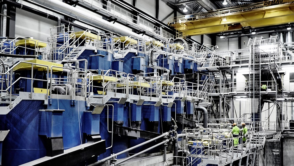 The flotation cells play a central part in the extraction of ore. In the flotation process, the ore is concentrated and valuable minerals are separated from the waste rock in a surface-chemical process, where air and small amounts of chemicals cause the mineral particles to float up to the surface of the flotation cell, where they can be removed.